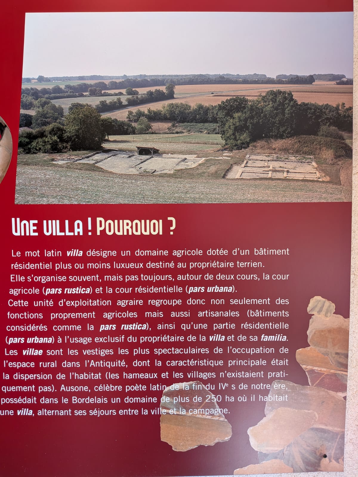 Plus de 40 années de fouilles archéologiques ont mis au jour l’espace résidentiel d’une ancienne exploitation agricole antique. Cette demeure occupée du Ier siècle av. J.-C. au Ve siècle ap. J.-C. a livré une grande quantité d’objets archéologiques. Des décors peints exceptionnels font la richesse de ce site.